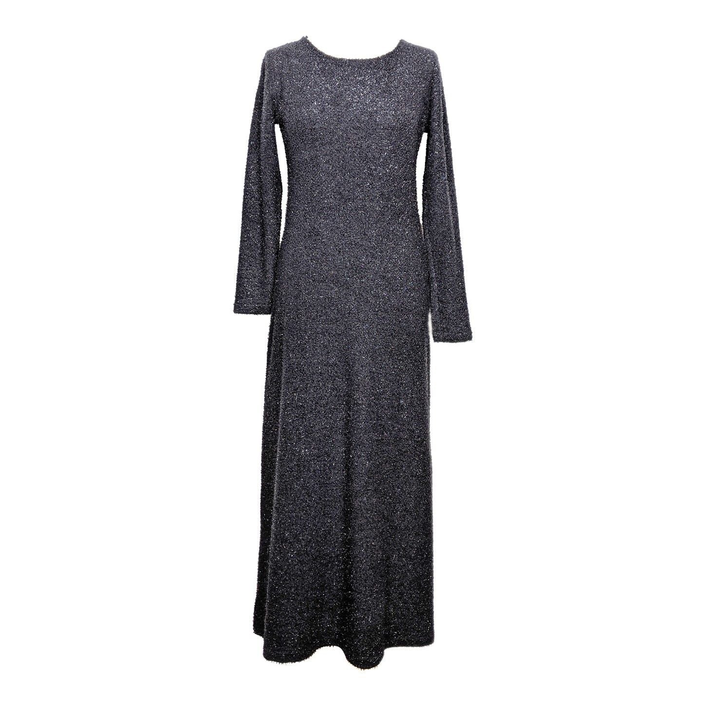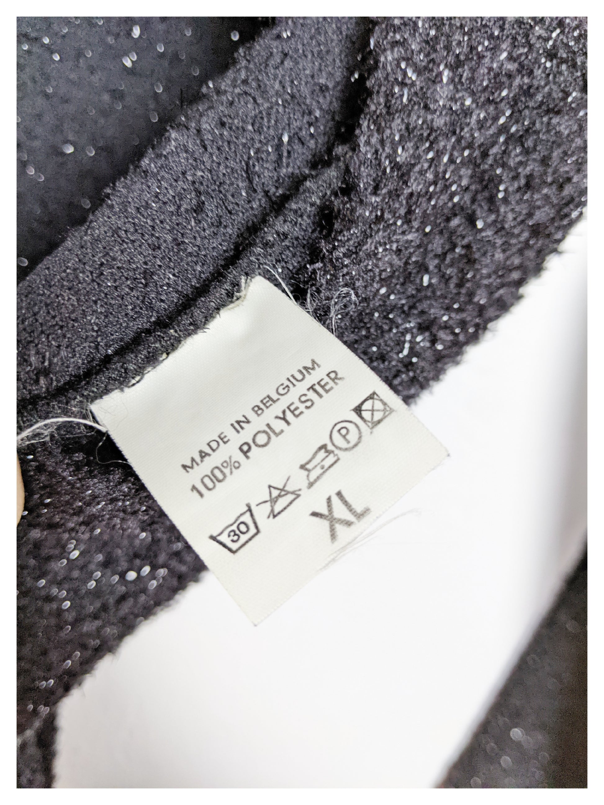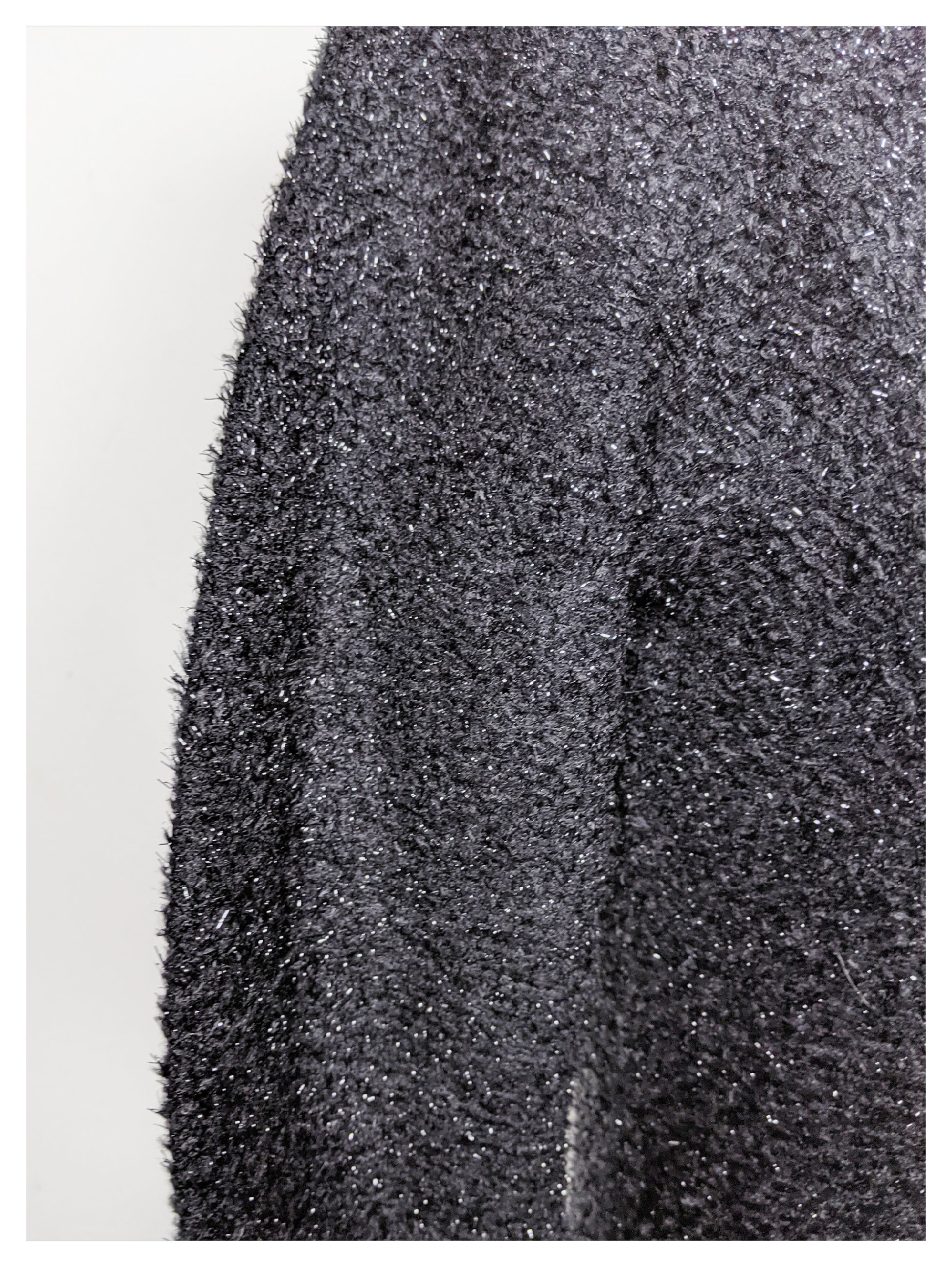 Magnifique robe de soirée noire, en tissu à "poils" courts brillants. Décolleté rond sur l'avant, cintrée, voire moulante mais la jupe est trapèze. Décolleté croisé dans le dos (topissime). Longueur midi, ou longue si on est plus petite. Assez épaisse et légèrement élasthanne. J'ai indiqué qu'elle datait des années 80's, mais elle pourrait être du début des années 90.