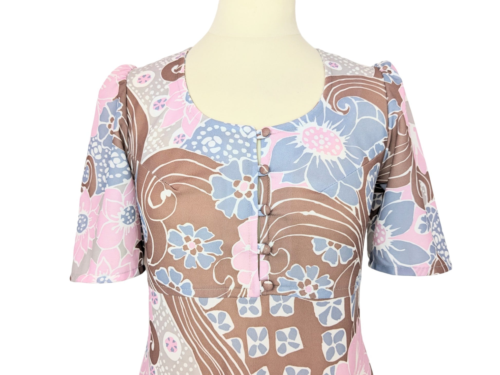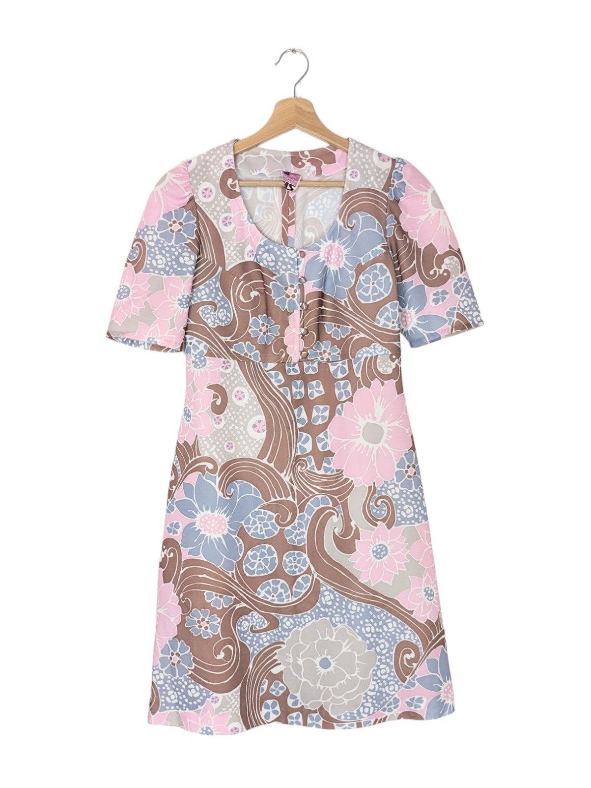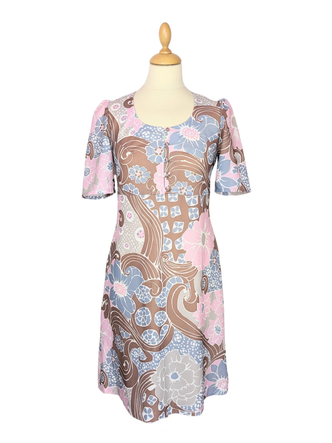 Jolie robe à motifs fleuris psychédéliques dans les tons rose clair, violine, marron, gris et blanc. Manches légèrement ballon et courtes. Décolleté arrondi. Pinces au niveau de la poitrine, 5 petits boutons décoratifs. Taille empire, et jupe trapèze.