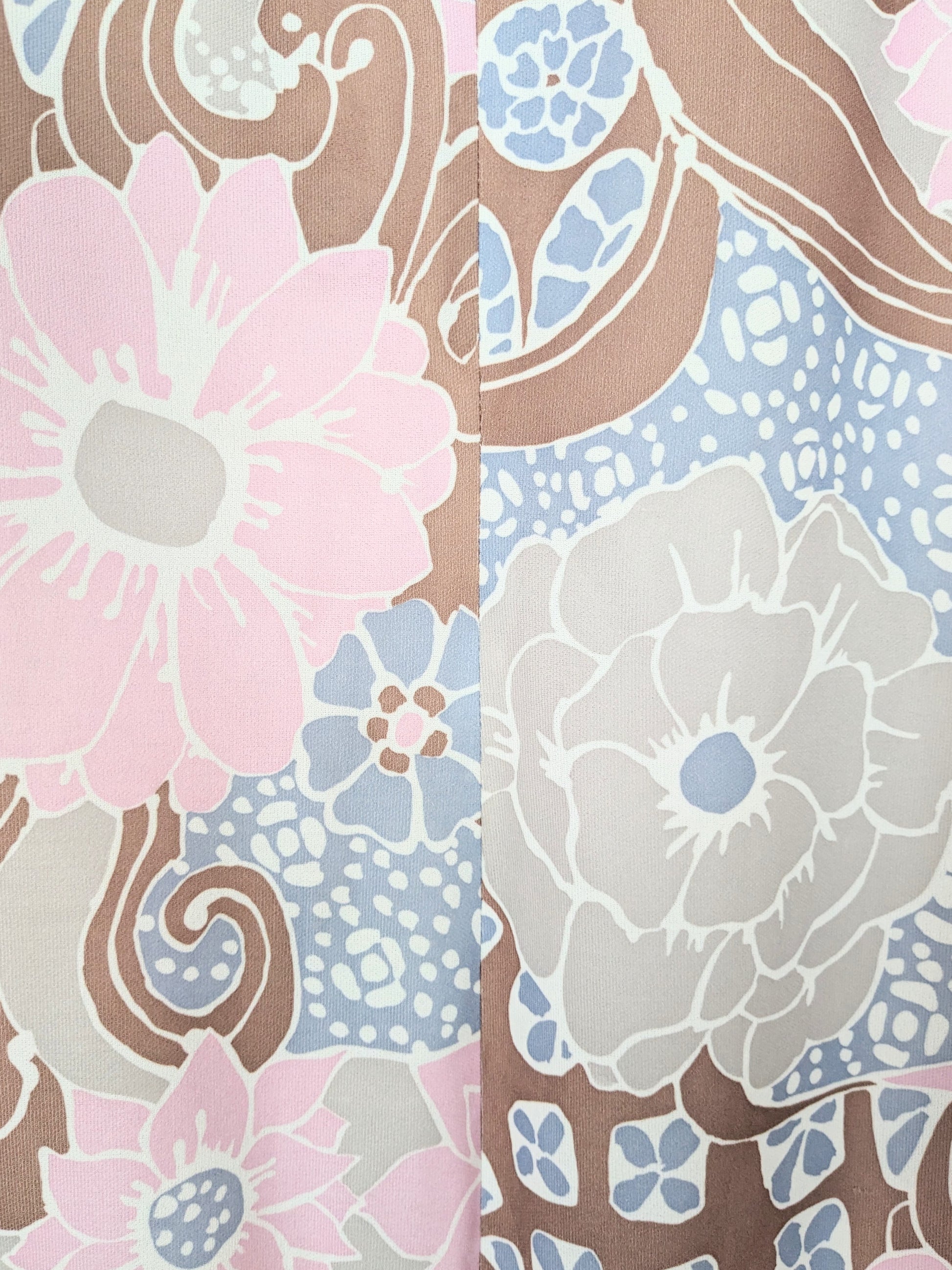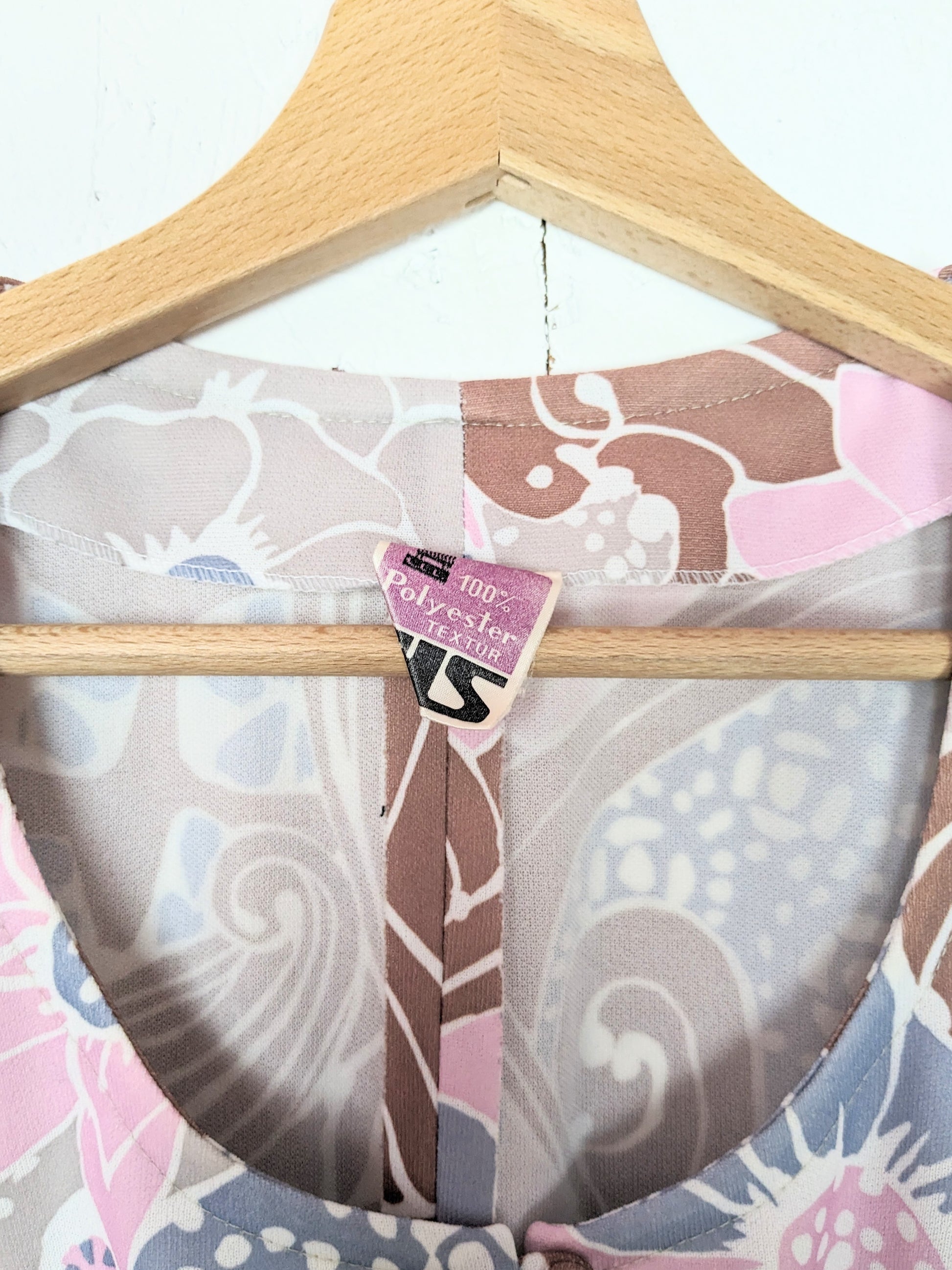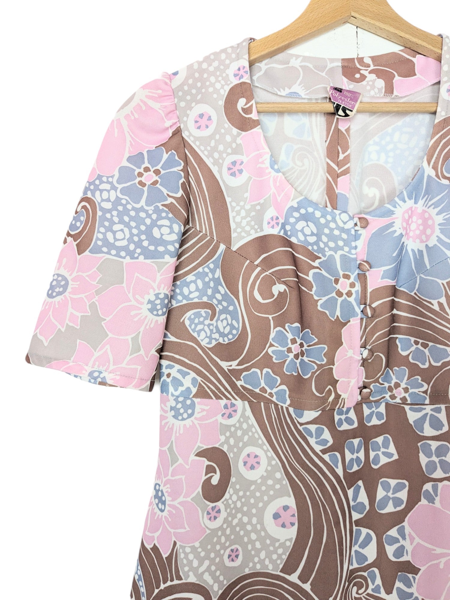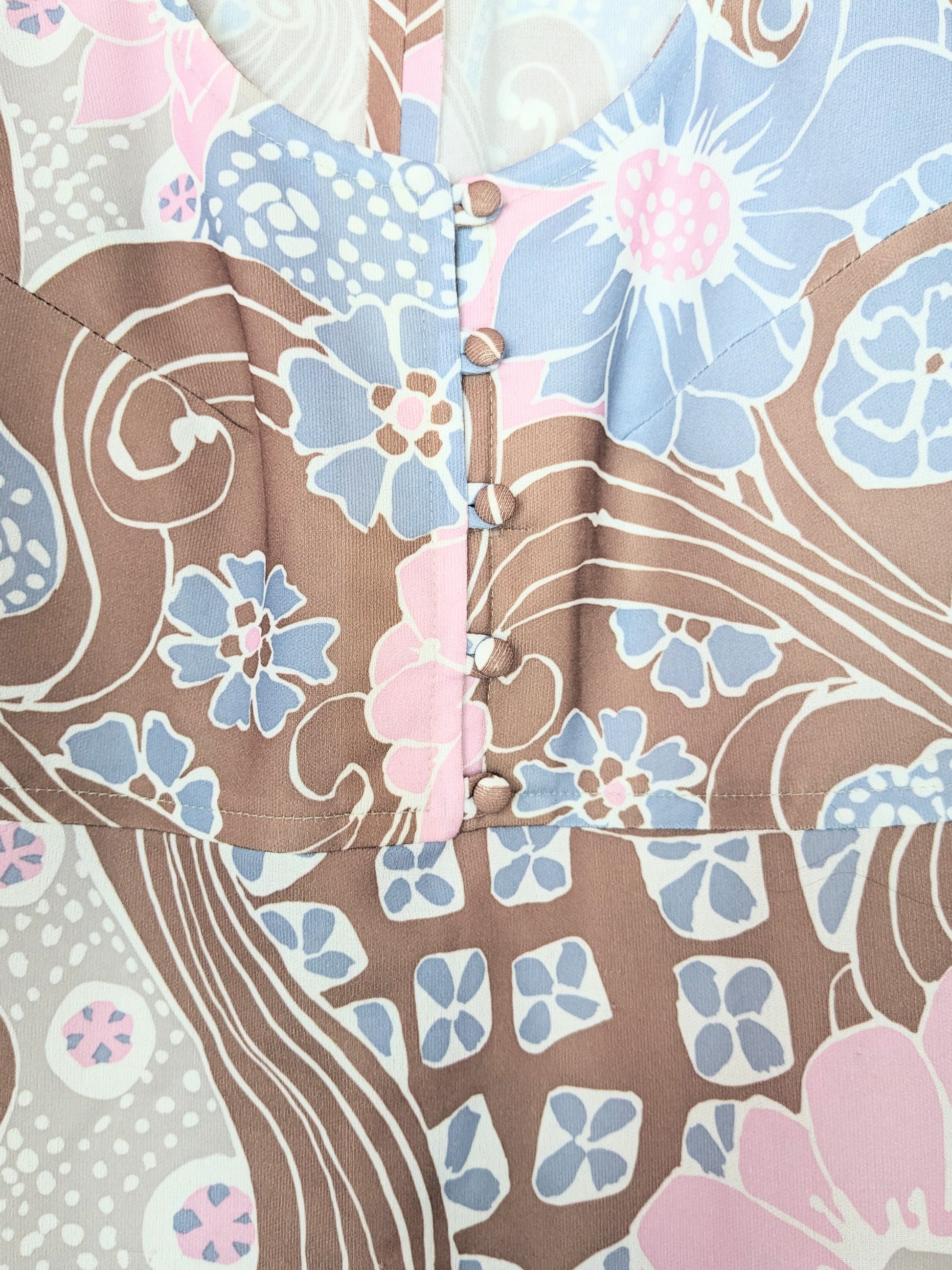 Jolie robe à motifs fleuris psychédéliques dans les tons rose clair, violine, marron, gris et blanc. Manches légèrement ballon et courtes. Décolleté arrondi. Pinces au niveau de la poitrine, 5 petits boutons décoratifs. Taille empire, et jupe trapèze.