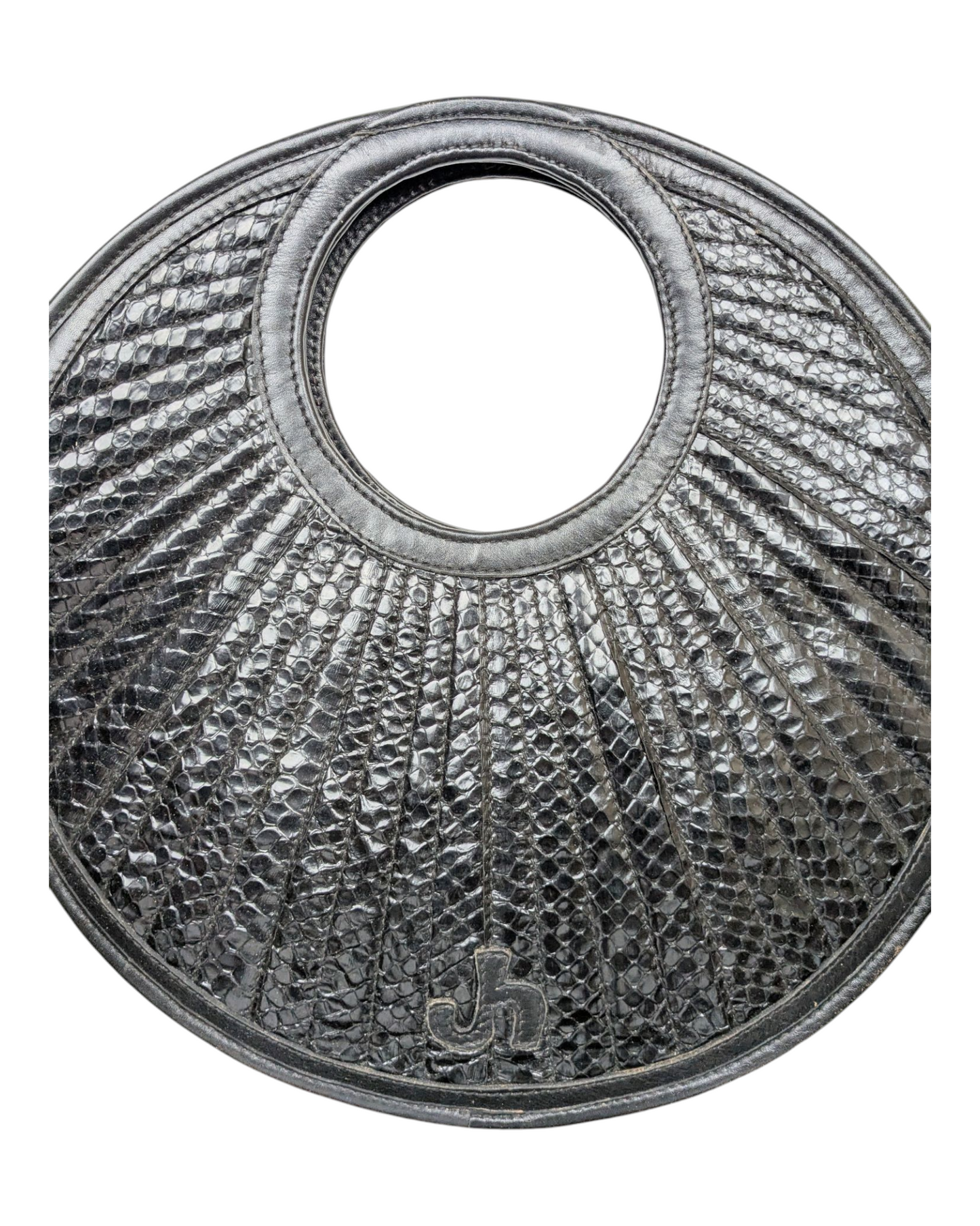 Superbe sac original de la marque Jacques Heim Motif serpent, rond avec poignée et hanse amovible.