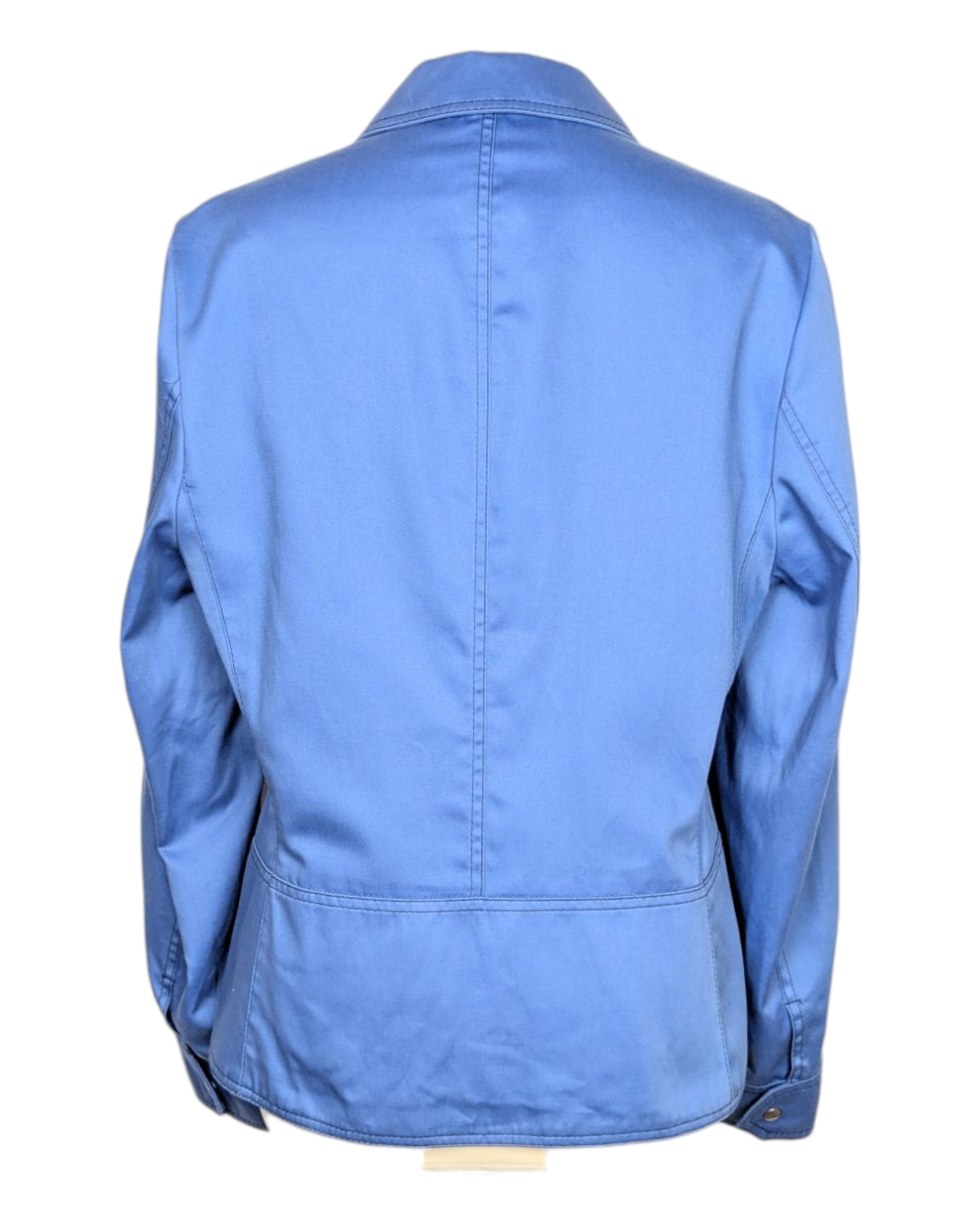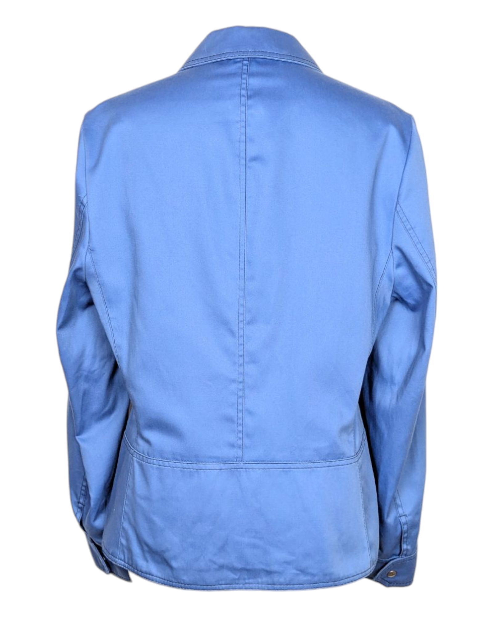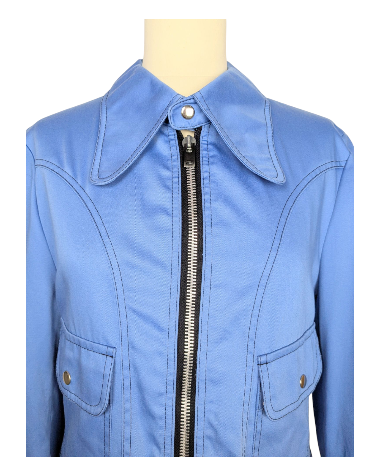 Très jolie veste mixte bleu ciel. Coupe typique des années 70s. Col à tarte, cintrée, boucles et fermetre éclaire visible. Superbe.